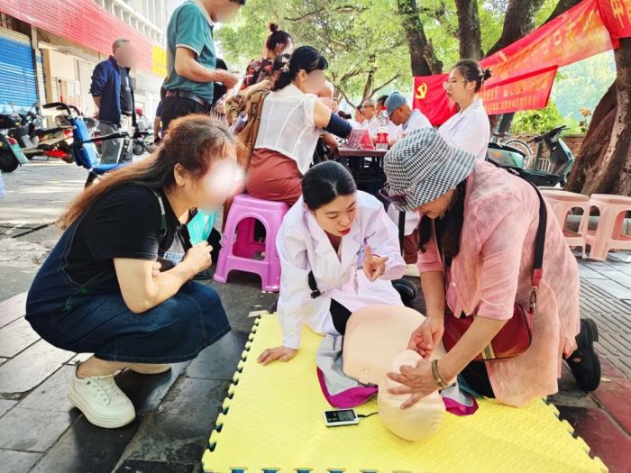 活动还邀请了中南大学湘雅二医院桂林医院住院医师规范化培训基地的规培生到现场,为居民科普心肺复苏术的实施方法。心肺复苏术的普及可以提高公众对急救的认识和意识,让更多的人了解急救的基本知识和技能。这不仅可以帮助人们更好地应对突发状况,还可以提高公众的健康意识,促进全民健康水平提升。