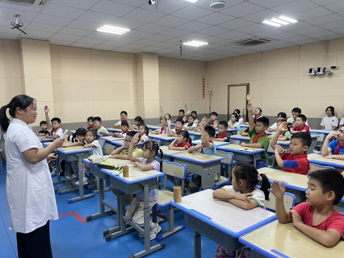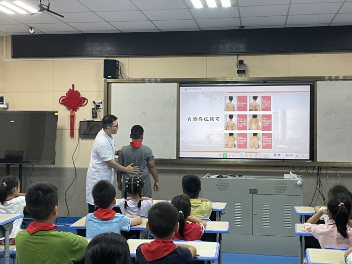 活动当天,党员志愿者们带来了一场生动有趣的中医知识盛宴。外治康复部林为栋医生详细讲解了脊柱侧弯的临床表现、自测技巧及中医防治方法,为了让学生们更直观地了解颈椎病防治,林医生还现场示范了颈椎病保健体操,帮助学生们缓解颈椎疲劳,预防颈椎病。针灸科李玉琼医生以其专业的视角,为孩子们揭开了针灸的神秘面纱,围绕针灸起源、针具发展、生活中常用保健穴位展开讲解,激发了学生们对针灸知识的兴趣。乳腺科雷丽萍护士则巧妙地将耳穴知识与实际操作相结合,通过播放演示视频和利用耳部模型,手把手地教学生们如何按摩耳朵上的穴位,让他们亲身体验到中医耳穴疗法的独特魅力。活动现场气氛热烈,学生们不仅听得津津有味,还积极参与互动问答环节中,踊跃回答问题。