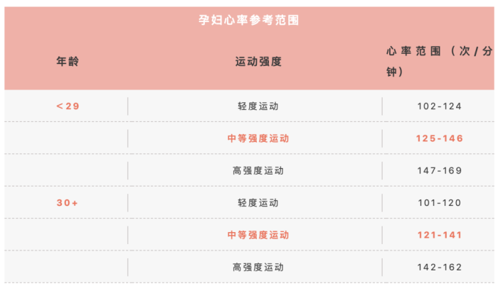 孕期运动以中等强度为宜,即运动时心率应达到心率储备的60%~80%,或感知运动强度评分应为13分~14分。此外,使用“谈话测试”是另一种衡量运动程度的方法,即孕妇的主观感觉运动“有点困难”,但仍可以在运动的时候与人交谈,这就说明该运动强度对孕妇来说不会过于轻松或过度剧烈。