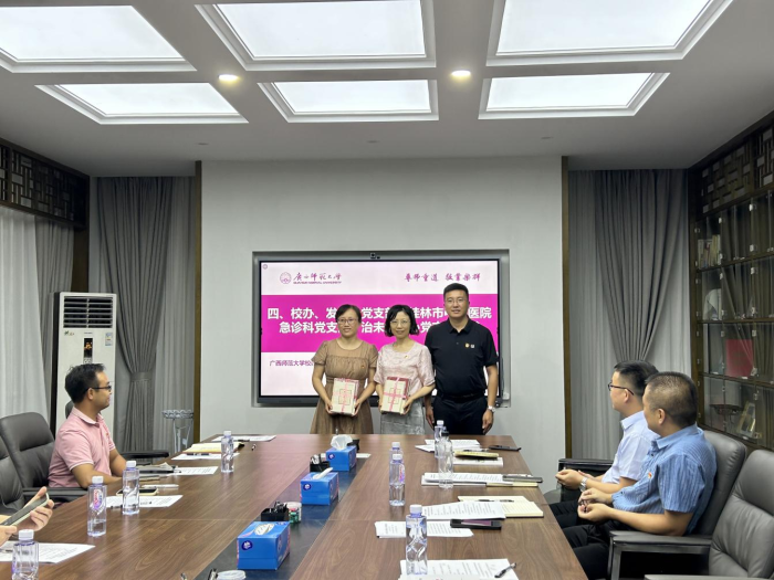 党课结束后,治未病中心党支部李雪瑾现场进行中医药健康文化素养知识宣教,急诊科党支部书记邓遵则开展急救知识教学。广西师范大学校办、发规处党支部特向我院急诊科党支部、治未病中心党支部赠送了书本一批。当天下午,双方党支部还一同参观了广西师范大学王城校区廉洁文化教育基地、王城博物馆。