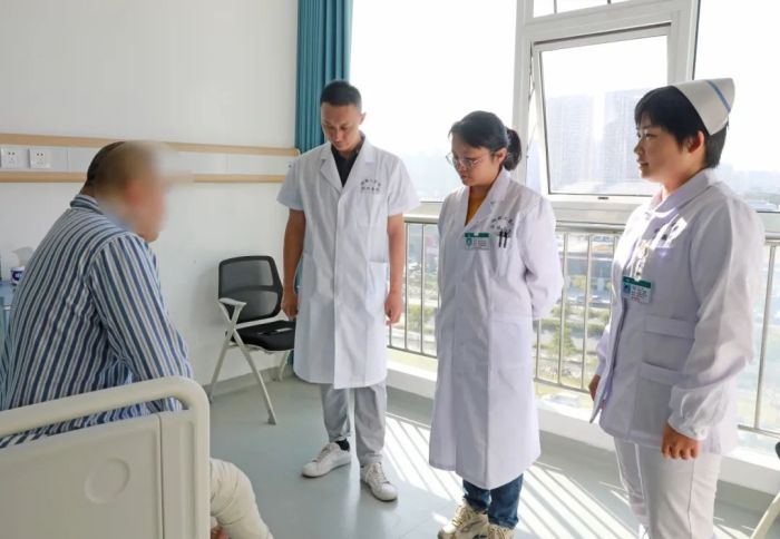 患者出院前,骨科一病区(关节、脊柱)行政主任易平、肿瘤血液科行政副主任贺华查看患者恢复情况