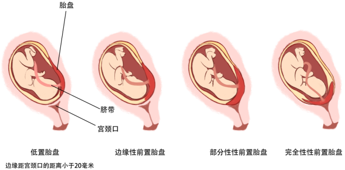 根据胎盘下缘与宫颈内口的关系,前置胎盘分为四类:中央性前置胎盘(完全性前置胎盘)、部分性前置胎盘、边缘性前置胎盘、低置胎盘(边缘距宫颈口的距离小于20毫米)。