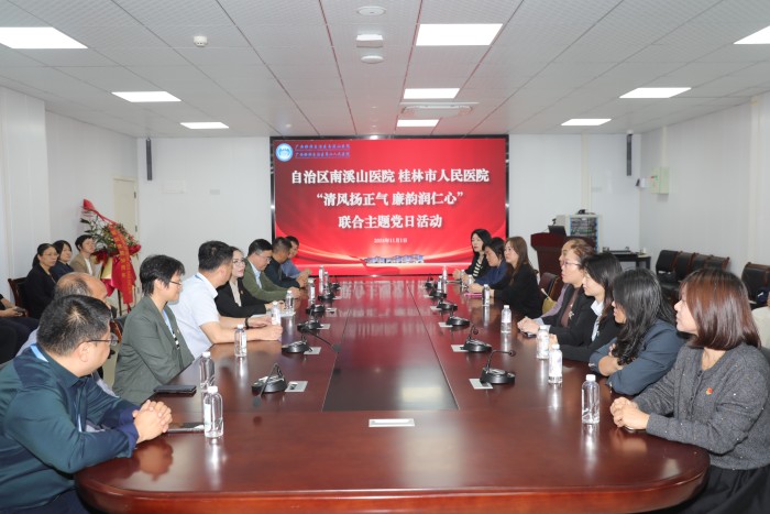 为弘扬清风正气,加强廉政文化建设,进一步提升党员干部的廉洁自律意识,11月1日下午,广西壮族自治区南溪山医院与桂林市人民医院联合开展“清风扬正气 廉韵润仁心”主题党日活动。自治区南溪山医院党委委员、纪委书记喻泽军,桂林市人民医院党委副书记、纪委书记赖玉珊与双方医院相关科室主要负责人共75人参与活动。