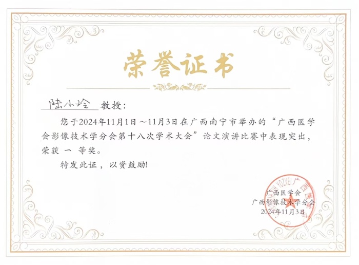 11月1日-3日,广西医学会影像技术学分会第十八次学术年会暨第四届影像后处理培训班在南宁成功举办。本次学术大会内容丰富多彩,形式灵活多样,开设了专题讲座、后处理培训班、论文演讲比赛等环节。在论文演讲比赛中,广西壮族自治区南溪山医院医学影像科技师陆小玲以总分第一名的成绩荣获论文演讲比赛一等奖。
