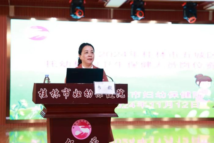 市妇幼保健院副院长韦毅进行了培训动员,她分析了当前全市托幼机构卫生保健工作形势和培训目的,她表示,本次培训旨在让大家进一步了解儿童卫生保健规范,增强管理意识,提高服务能力,为全体儿童创造良好的生活环境,预防控制传染病,降低常见病的发病率,保障儿童的身心健康。同时,希望参会人员能够认真听取专家的经验分享,学有所得、学有收获,更好地胜任托幼机构保健员的岗位,为桂林市儿童健康事业做出更多更大贡献。
