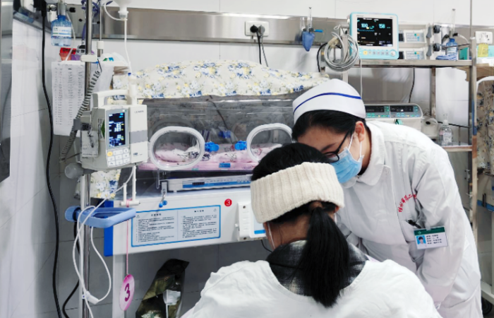 近日,中南大学湘雅二医院桂林医院有一对双胎早产儿出生在即。由于产妇为“选择性胎儿宫内生长Ⅲ型”,为保障母婴安全,医师决定为产妇进行择期剖宫产。新生儿出生后,医护人员立即将其转运至预热好的新生儿科培养箱中,并在“黄金一小时内”为其连接了呼吸机辅助设备和心电监护,并做好开通静脉通路、及时检测血糖等措施稳定新生儿的生命体征。经过医护人员23天的精心呵护,这对出生时体重仅1480克、1860克的早产双胎于近日顺利出院。