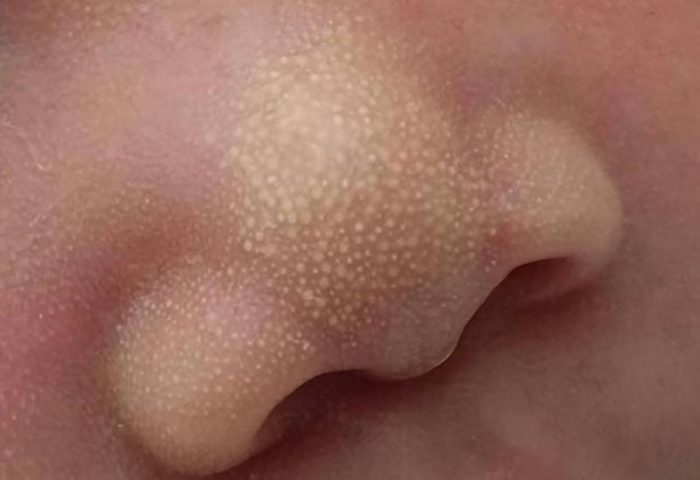 在新生儿鼻尖、鼻翼、颊、颜面等处,常可见到因皮脂腺堆积形成的针头样、黄白色的粟粒疹。粟粒疹是由于皮脂腺分泌旺盛,导致皮脂堆积而形成。脱皮后可自然消失,宝爸宝妈不需处理。