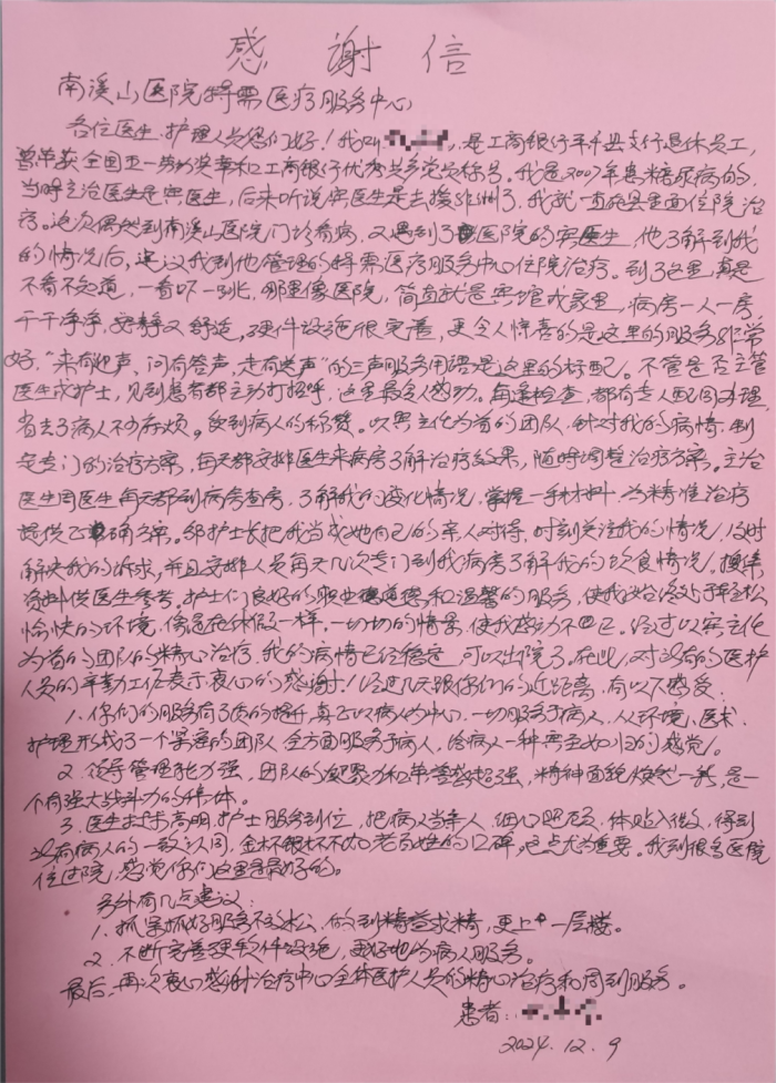 近日,在自治区南溪山医院特需医疗病区,上演了一幕温馨的医患情深故事。一位全国劳模称号的糖尿病患者,在经过精心治疗后顺利出院,他满怀感激,亲自送来了一封饱含深情的感谢信,以表达对特需医疗团队专业治疗与细致关怀的由衷感谢。