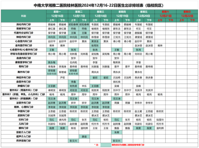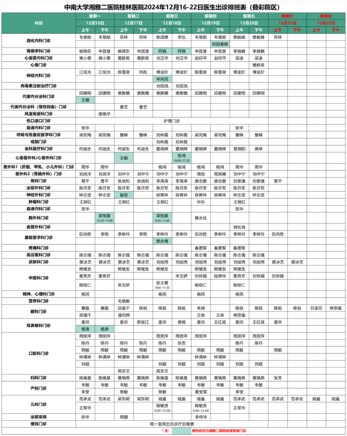 表格中浅绿色标识为湘雅二医院驻桂专家出诊信息