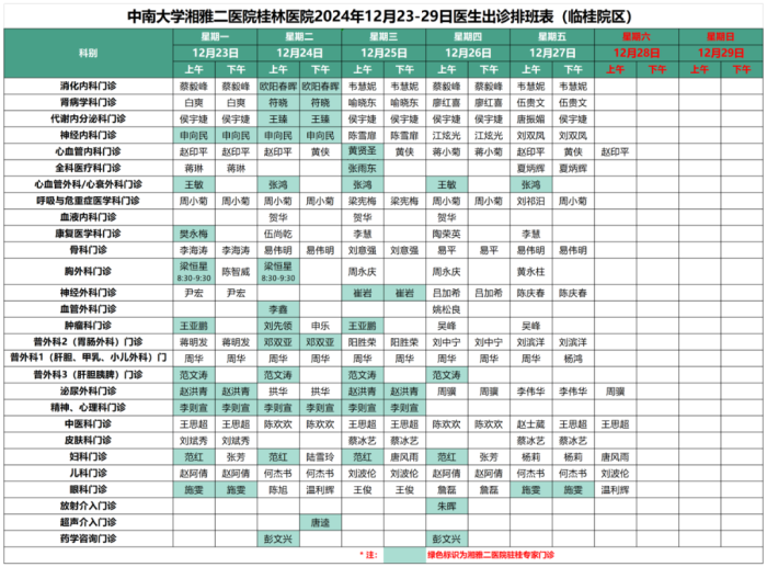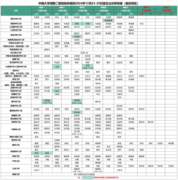 表格中浅绿色标识为湘雅二医院驻桂专家出诊信息