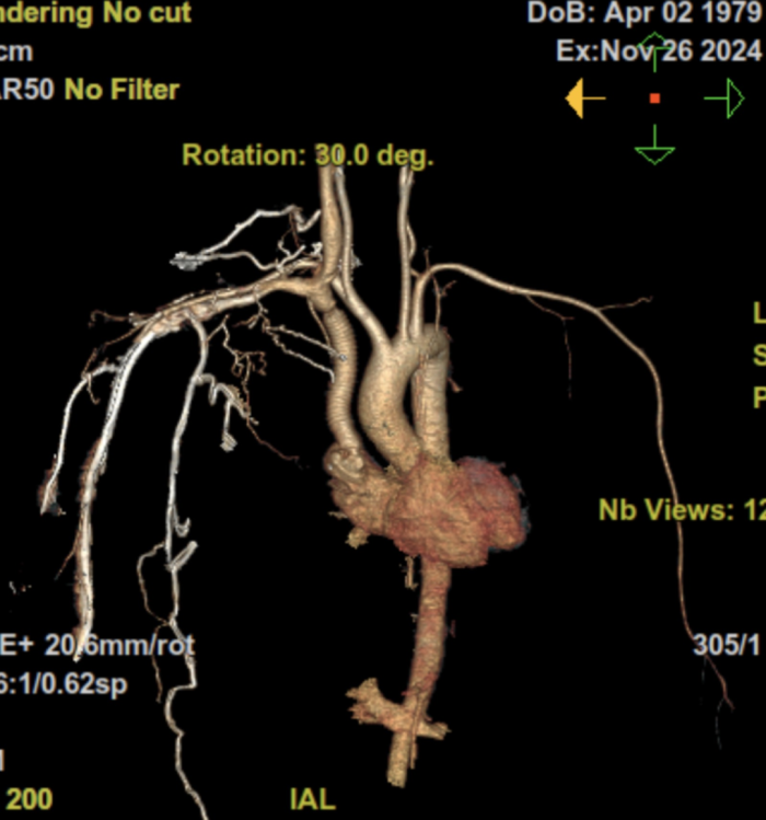 为了保障患者生命安全、提高手术成功率,在发现胸部纵隔占位的第四天,梁恒星主任通过医院组织了胸外科、心脏大血管外科、麻醉科等科室的MDT联合会诊。经过充分的讨论后,专家团队认为,由于患者纵隔病变很可能是胸腺肿瘤,对内科治疗不敏感,立即手术几乎是患者生还的唯一机会。但是患者病变范围广泛,且包绕并累及上腔静脉及其三大属支(左右无名静脉及其静脉),使得无论是手术中完整切除肿瘤,还是保护心脏、大血管结构和脑保护,都变得相当困难。如果手术中发现肿瘤累及了心脏结构,术中大出血和随之而来的脑水肿、脑保护又成了一个摆在手术团队面前的难题。