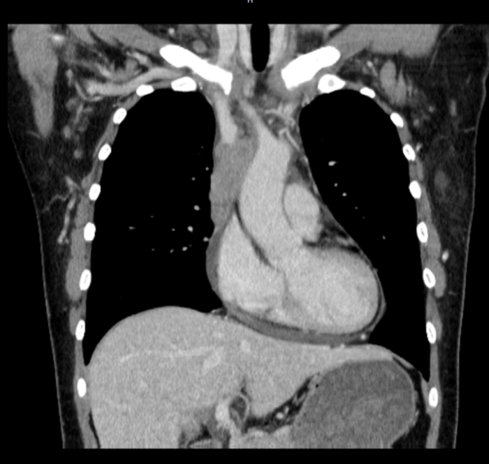 患者术前CT结果提示纵隔肿瘤侵犯上腔静脉及其所有属支