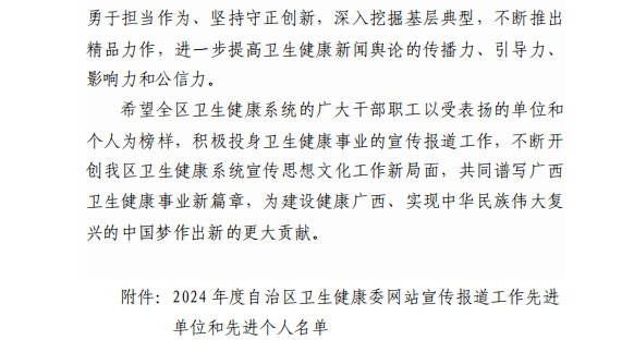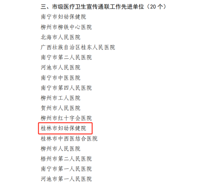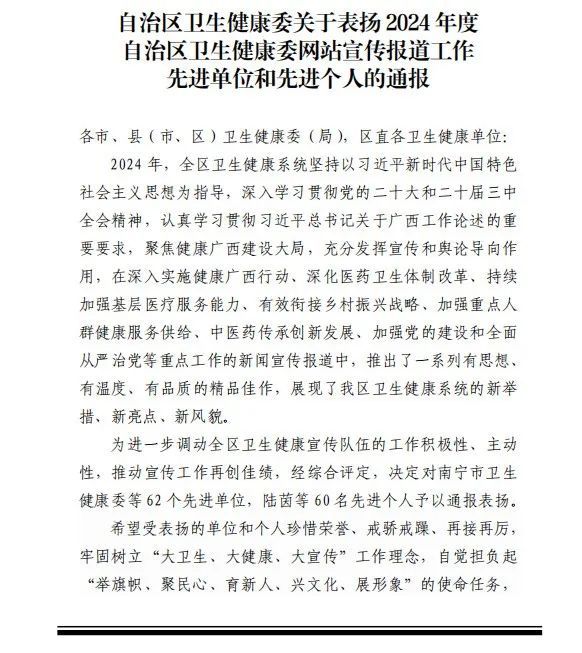 近日,广西壮族自治区卫生健康委发布了《关于表扬2024年度自治区卫生健康委网站宣传报道工作先进单位和先进个人的通报》,桂林市妇幼保健院获评为“宣传通联工作先进单位”,宣传教育科朱雄诗荣获“宣传通联先进个人”。