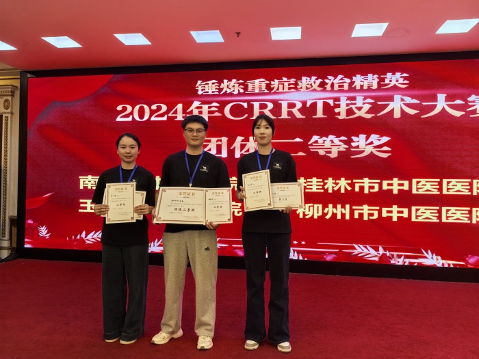 11月23日,广西中医重症医学质量控制中心主办的2024年CRRT技能比赛圆满落幕。桂林市中医医院重症医学科医护团队凭借精湛的专业技能和出色的团队协作,在比赛中获得“团队二等奖”及“技能比赛第二名”。