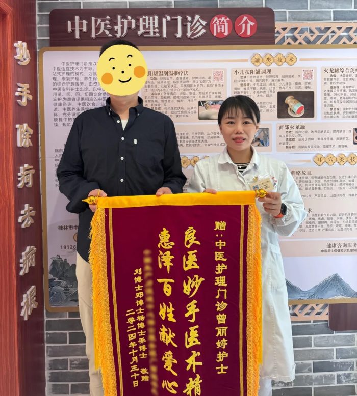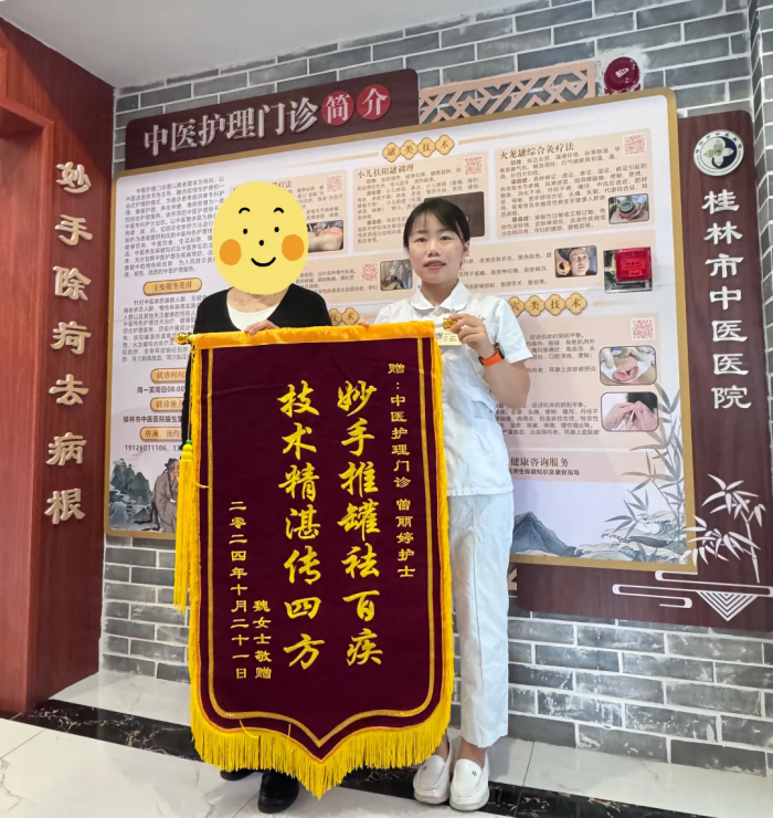 对于医护人员来说,看到患者治愈康复,辛勤工作得到肯定和认可,是尤为开心的事。近日,桂林市中医医院中医护理门诊收到了四面分别题有“妙手推罐祛百疾 技术精湛传四方”“乳腺疏通技术精湛 用心呵护尽职尽责”“良医妙手医术精 惠泽百姓献爱心”“医术精湛暖人心 妙手回春展风采”字样的锦旗,这些锦旗的背后,都是中医护理人与患者间双向奔赴的故事。