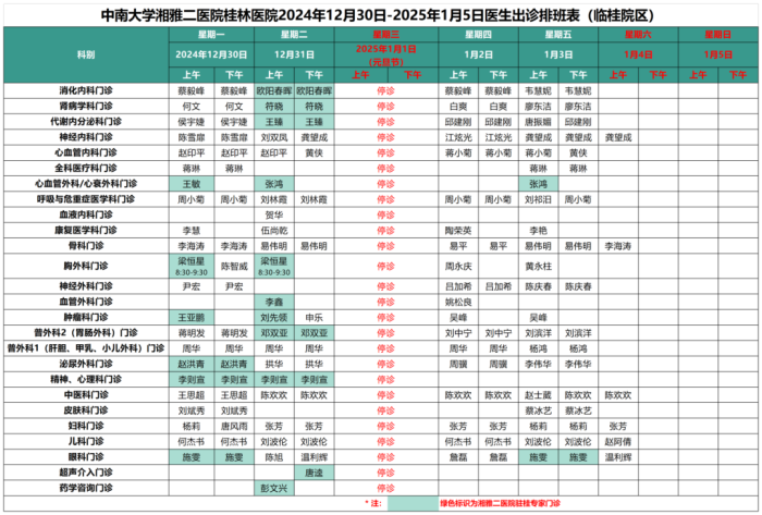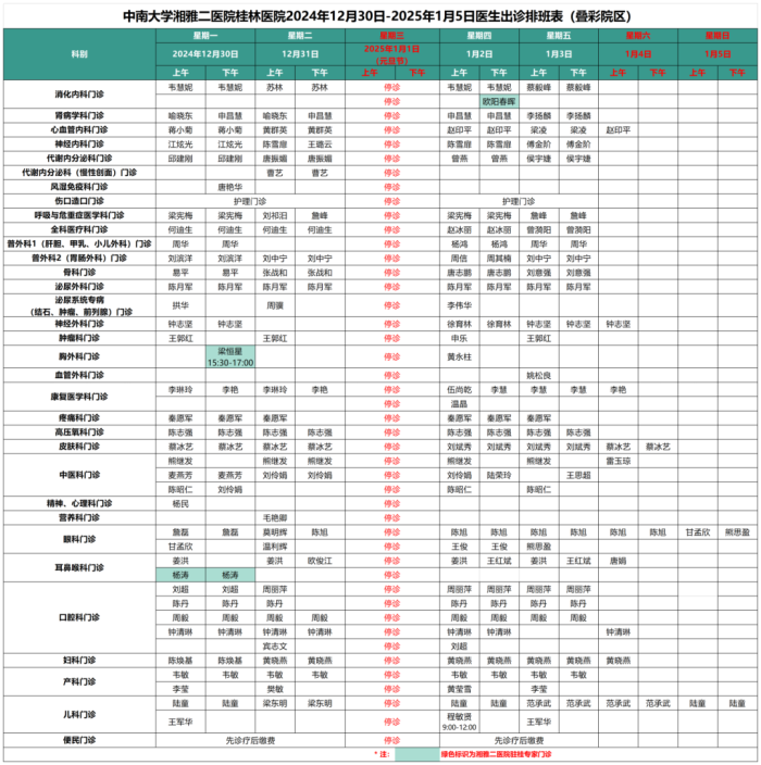 表格中浅绿色标识为湘雅二医院驻桂专家出诊信息