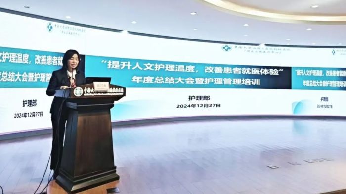 护理部副主任陶亚鑫汇报了“提升人文护理温度,改善患者就医体验”专项活动年度总结,通过数据分析和改善实例,全面展示了一年来医院在落实《进一步改善护理服务行动计划(2023-2025年)》和《改善就医感受、提升患者体验主题活动方案》方面所做出的努力与取得的成效,让参会者清晰地看到了医院在提升患者就医体验道路上的坚定步伐。
