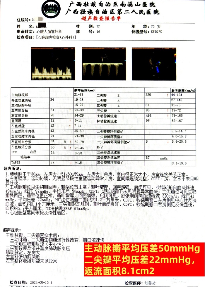 患者70岁女性,身高158cm,体重39kg,2017年在南溪山医院行主动脉瓣、二尖瓣双生物瓣膜置换术,术后未规律随访,并自行停用相关药物,2024年2月开始出现活动后气促,平地行走20米即感不适,于2024年5月入院,超声心动图检查提示:主动脉瓣、二尖瓣人工瓣膜均出现功能障碍。