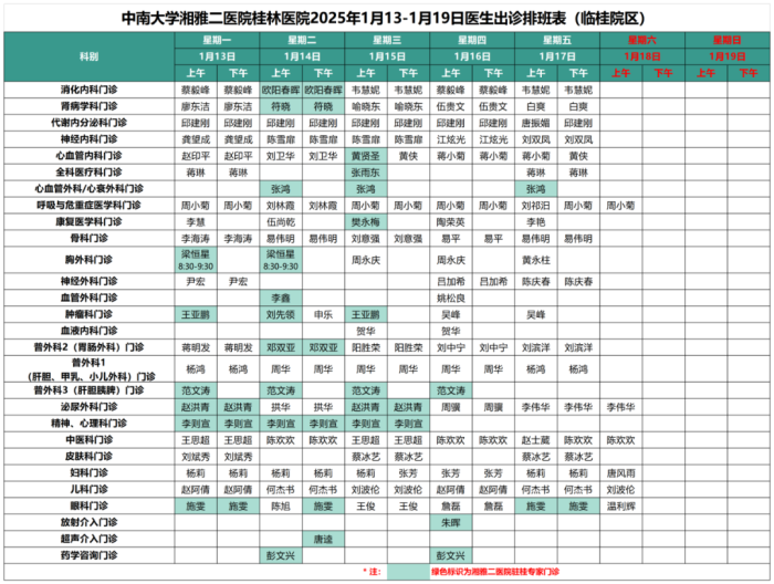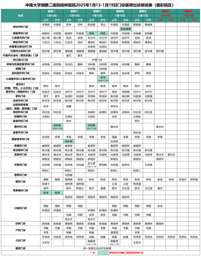表格中浅绿色标识为湘雅二医院驻桂专家出诊信息