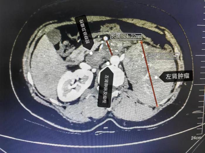近日,45岁的黄女士日前因“间歇性尿血伴腰痛3天”就诊于南溪山医院。经检查结果发现一个直径超10cm的巨大左侧肾肿瘤且伴肾静脉瘤栓及下腔静脉瘤栓!目前肾癌伴肾静脉癌栓及下腔静脉癌栓最有效的治疗方法是行肾根治性切除术+肾静脉瘤栓取栓术+下腔静脉瘤栓取栓术,但手术中极易出现瘤栓脱落而导致猝死,手术风险极高,术中需精准分离下腔静脉、肾静脉等大血管,且该患者癌栓直径近3厘米,肿瘤巨大,导致空间狭小、分离困难。该手术是泌尿外科超高难度的标志性手术,也被称之为“皇冠上的明珠”。