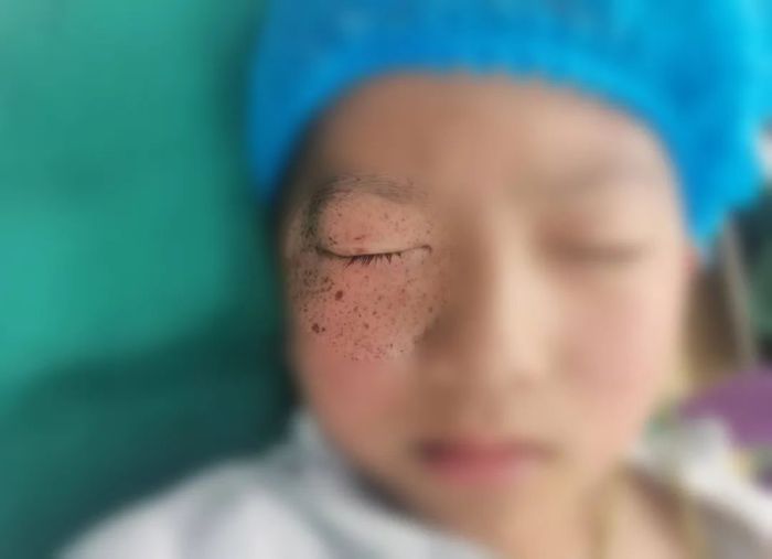 这名男孩在燃放鞭炮时发生意外,导致面部、眼部广泛灼伤,并伴有异物残留,双眼紧闭无法睁开,情况危急。父亲见状,立即将其送往中南大学湘雅二医院桂林医院进行紧急救治。经医生细致检查,发现男孩双眼角膜布满大量黑色点状异物,部分异物甚至深入角膜基质层。