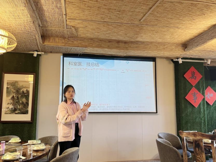 科室年终总结大会在执行主任樊永梅的热情致辞中拉开序幕。主任、护士长、康复治疗组长分别通过精心制作的PPT进行了年度工作汇报。行政副主任伍尚乾全面总结了科室在医疗业务、科研创新、科室宣传等方面的工作情况,展示了过去一年里科室在疾病诊疗、新技术开展、院级重点专科孵育项目获得等方面取得的显著成绩,同时也客观分析了目前面临的挑战和问题。护士长卿青双则聚焦护理团队建设、护理质量提升以及患者满意度等方面,分享了一系列行之有效的护理管理经验和优质护理服务举措。康复治疗组长贲维勇详细汇报了康复治疗工作的开展情况,包括治疗技术的改进、患者康复效果的评估等内容。