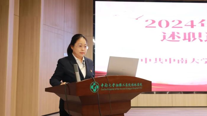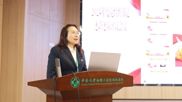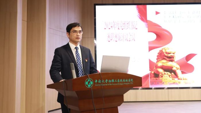 为督促党组织书记认真履行党建工作第一责任人职责,进一步推动医院党建提质增效,近日,中南大学湘雅二医院桂林医院在临桂院区九楼多功能厅召开2024年度党组织书记述职述廉评议会议。医院党政领导班子,各党总支、党支部委员会委员,部分党员代表和民主党派人士参加会议,会议由党委副书记范伟娟主持。