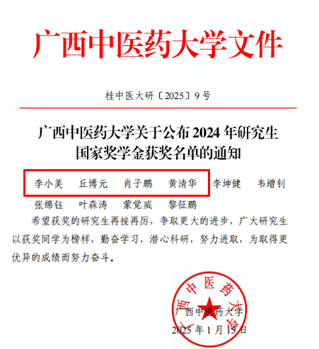 日前,广西中医药大学公布了《2024年研究生国家奖学金获奖名单的通知》,桂林市中医医院硕士研究生联合培养基地4名硕士研究生李小美、丘博元、肖子鹏、黄清华榜上有名,喜获国家奖学金。