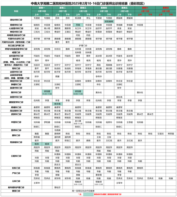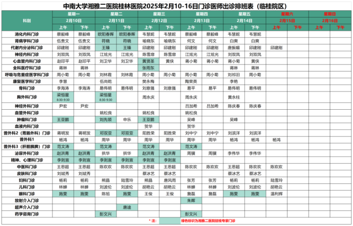 表格中浅绿色标识为湘雅二医院驻桂专家出诊信息