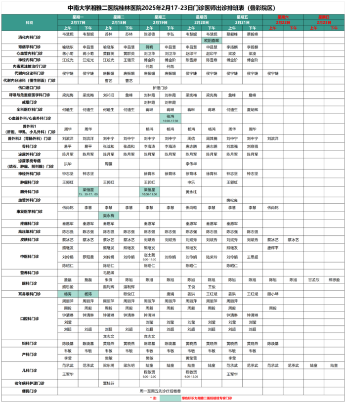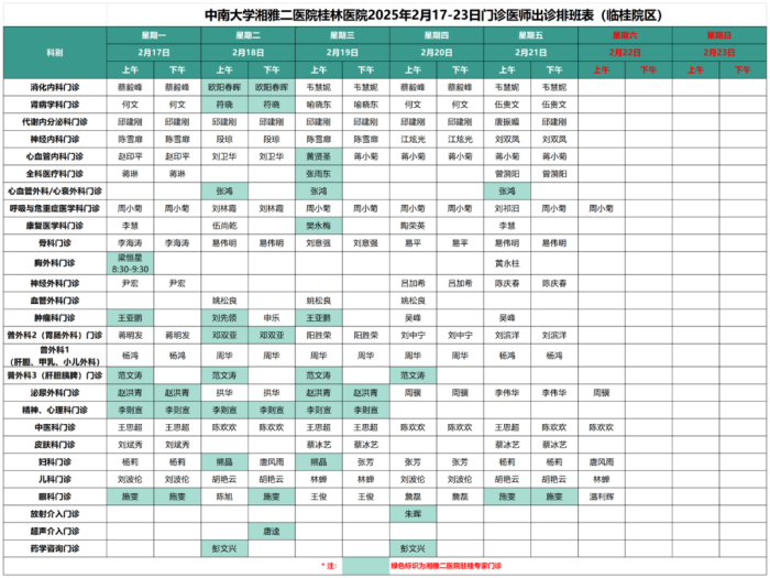 表格中浅绿色标识为湘雅二医院驻桂专家出诊信息