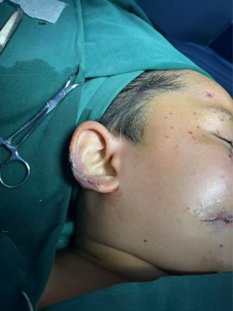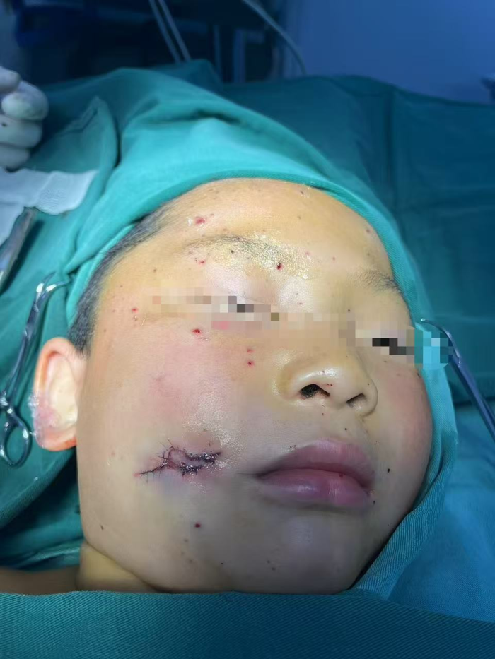 下面是两位小朋友在楼下玩鞭炮,脸颊不慎被鞭炮意外炸伤。