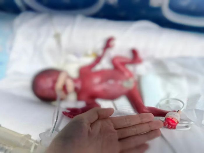 刚出生时,玲玲整个身体跟成人的巴掌差不多大小,胳膊还没成人的手指粗,皮肤呈半透明胶冻状,血管隐约可见,属于超低出生体重早产儿。由于早产,玲玲出现了自主呼吸微弱,且全身皮肤青紫。