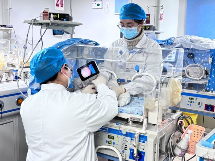 多学科会诊:眼科主任揭静正在为早产儿进行早产儿视网膜病变眼底筛查