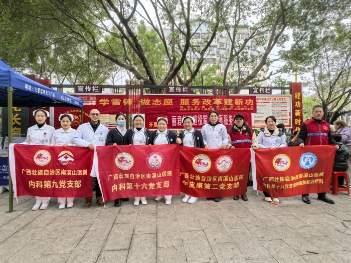 3月4日,在第62个全国“学雷锋日”到来之际,南溪山医院内科第九党支部(感染性疾病科)、内科第十六党支部(全科医学科)、内科第十八党支部(肿瘤放射治疗科)、内科第二十党支部(安宁疗护中心)、中皮康第二党支部(康复医学科)联合桂林市退役军人事务局“八桂军号”志愿服务支队,走进秀峰区信义广场,开展“学雷锋 做志愿 服务改革建新功”主题志愿服务活动,以实际行动传承雷锋精神,服务基层群众。