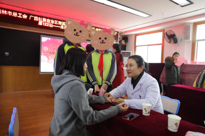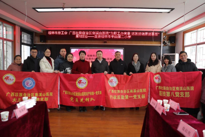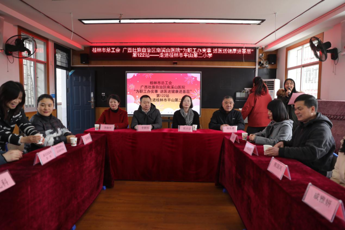 3月4日,在2025年的“三八”国际妇女节来临之际,为关爱教职工身心健康,推动优质医疗资源下沉,应桂林市平山第二小学邀请,桂林市总工会与广西壮族自治区南溪山医院联合开展“为职工办实事 送医送健康进基层”第122站义诊活动。南溪山医院专家团队走进校园,为教职工提供多学科“零距离”健康咨询服务,以实际行动诠释“健康守护者”的使命,为园丁们献上春日健康大礼。