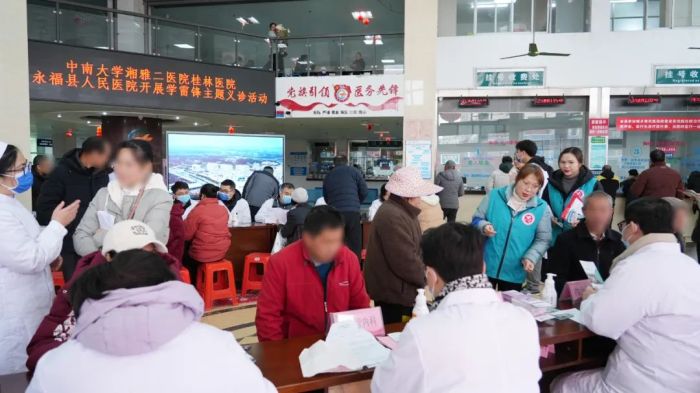 医院组织心血管内科、心血管外科、肾内科、胃肠外科、泌尿外科、口腔科、妇科、眼科、代谢内分泌科、骨科、肝胆甲乳小儿外科、中医科、康复医学科等10余个科室的30余名专家,为居民提供各类常见病、慢性病等专业的疾病咨询及个性化健康指导。在3月6日永福县人民医院驻桂专家专场义诊活动中,湘雅专家团队针对当地群众高发的慢性病、心脑血管、关节疼痛等疾病,制定“一对一”治疗方案,获得当地居民点赞:“不用奔波到市区,在家门口就能看名医,太贴心了!”