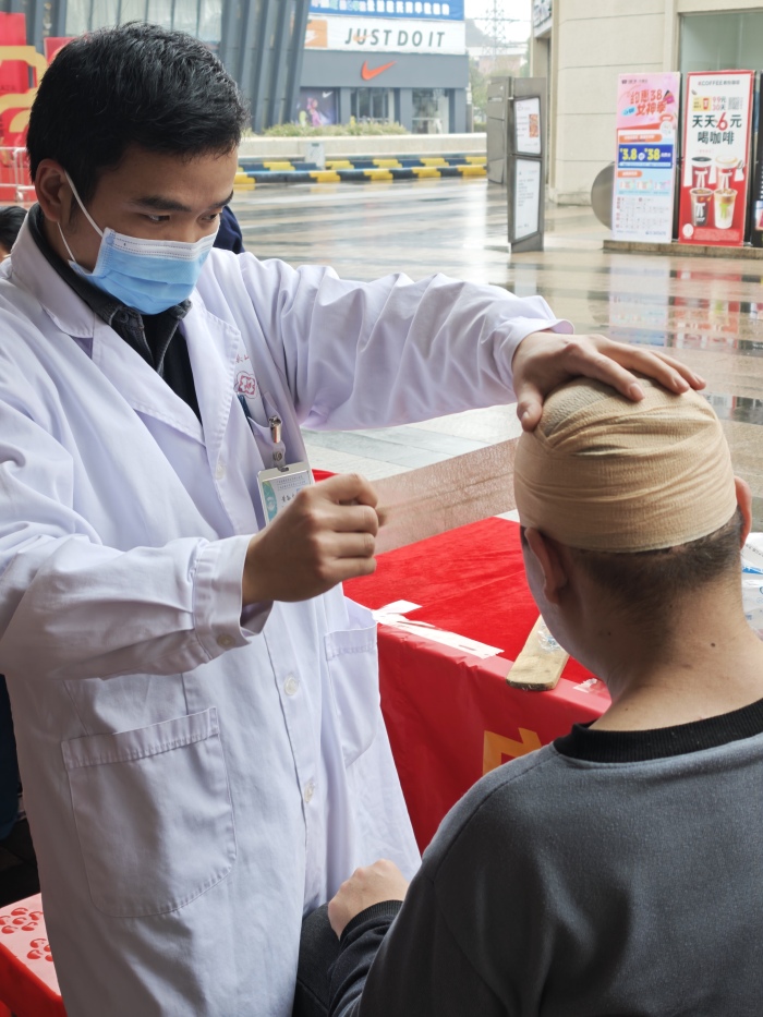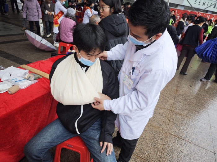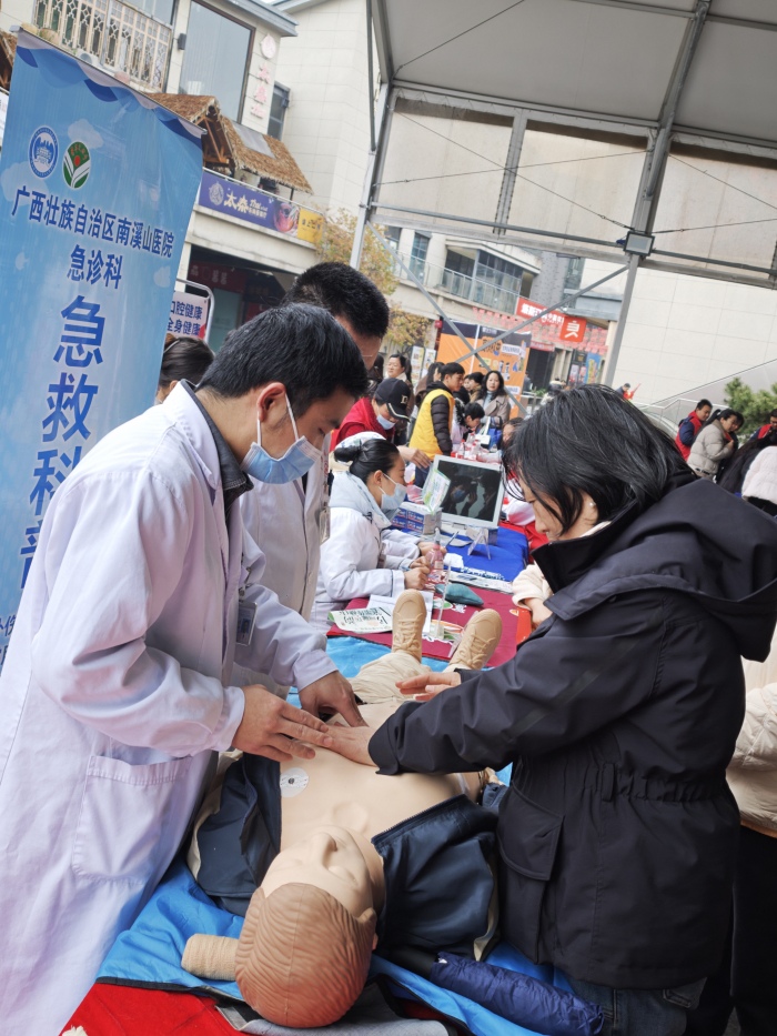 自治区南溪山医院急诊科(广西青年文明号)青年团队来到桂林市万福广场,快速布置场地后就开始了当天的急救科普志愿服务活动,医护人员通过“讲解+实操”的方式,手把手指导市民学习处理心脏骤停、气道异物梗阻、外伤出血等常见急救场景,并通过模型实操掌握徒手心肺复苏急救法、海姆立克法、外伤止血包扎等急救技能。