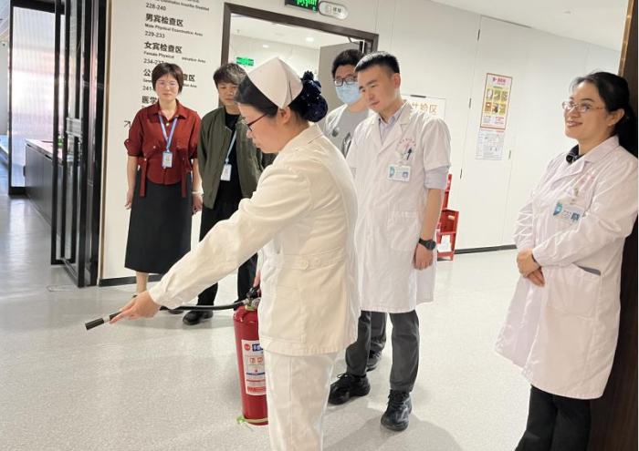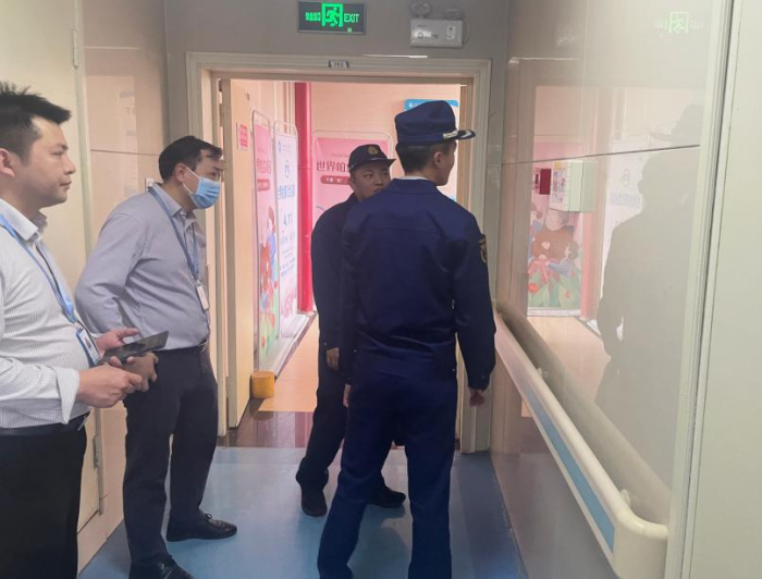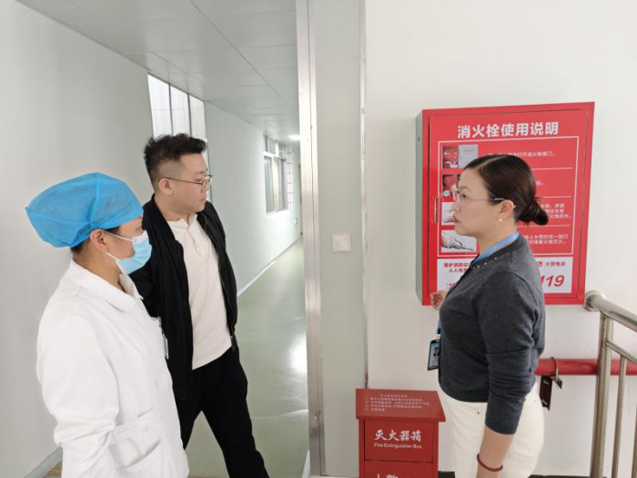 医院副院长唐芬带领小组检查消防设施