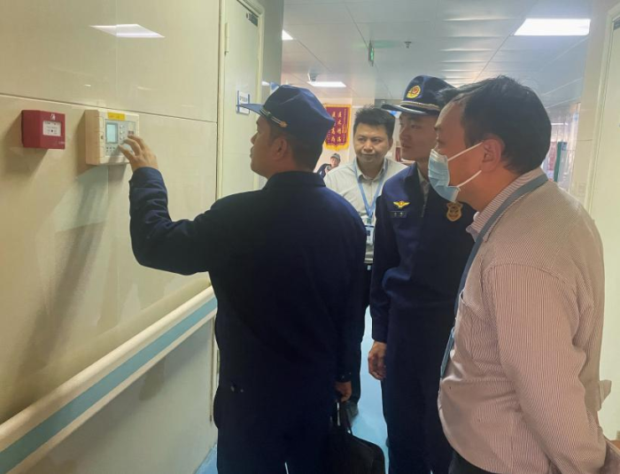 医院副院长胡长付带领小组检查住院部消防设施