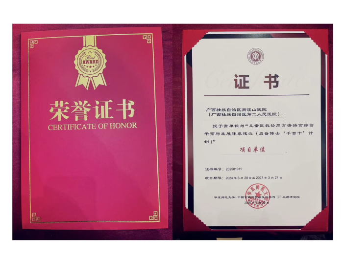 近日,南溪山医院儿童保健门诊顺利通过了由中国妇幼保健协会牵头与华东师范大学联合开展的儿童言语语言启音博士“千百十”项目评审,成为儿童医教协同言语“项目单位”,并正式授牌!这既是对其近一年儿童言语工作能力的认可,也是对其取得阶段性成果的褒奖。