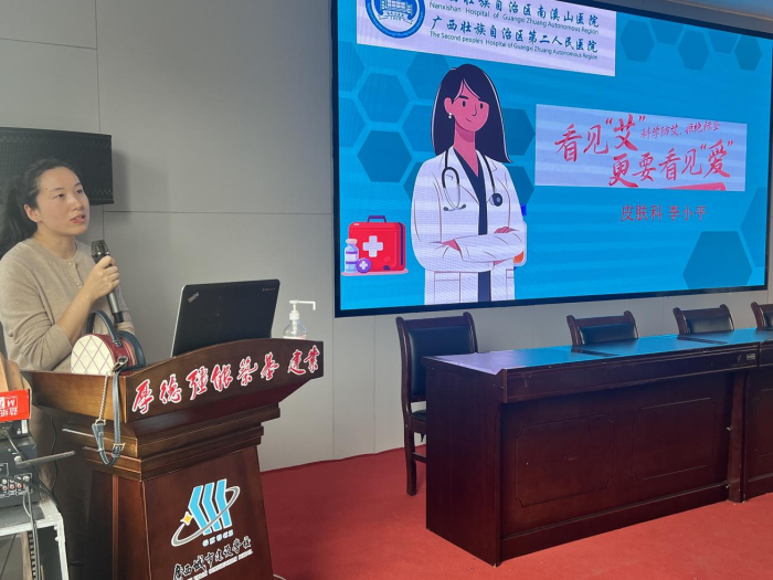与此同时,皮肤科科教副主任李小平医生开展了《看见“艾”更要看见“爱”》健康知识科普讲座,200名学生前来参加,教室内座无虚席。李小平结合青少年心理特点,讲解了皮肤疾病预防、艾滋病预防相关知识,“同学们记住,看见‘艾’更要看见对生命的关爱。”李小平医生将防艾知识巧妙融入“皮肤密码破解”互动游戏,讲解常见皮肤病的演变过程。学生在轻松的氛围中学习并掌握了科学防护技能。