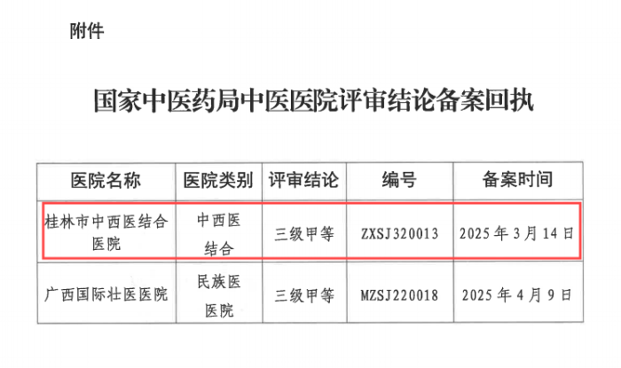 近日,自治区中医药管理局公布了桂林市中西医结合医院等级评审结果,我院成功通过新一轮三级甲等中西医结合医院复评审,标志着我院在学科建设、医疗质量、服务能力等方面实现跨越式提升,全面开启高质量发展新征程!