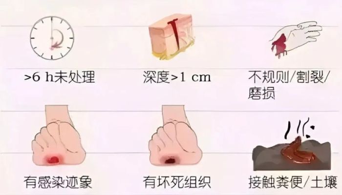 符合下述条件之一:未在6小时内进行医疗处理;伤口接触泥土、人或动物粪便及哺乳动物唾液等污染物;穿刺伤;撕脱伤;挤压伤;火器伤;烧烫伤及冻伤;存在未祛除的缺血或坏死组织;伤口内有未去除的异物;已有感染征象伤口等。