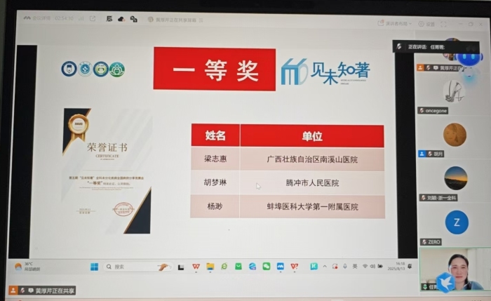 8月13日,由浙江省数理医学学会全科未分化疾病专委会、浙一全科联盟联合举办的第四期“见未知著”全国病例竞赛在杭州圆满落幕。自治区南溪山医院全科团队首次参赛,梁志惠主治医师凭借病例《全科侦察兵:从疼痛迷雾中捕捉消瘦信号》,从全国20家团队中脱颖而出,荣获一等奖。