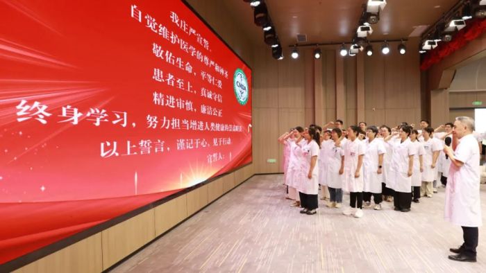 在新入职医师宣读《中国医师宣言》环节,新医师们身着白大褂,神情庄重,举起右拳,庄严宣读:“自觉维护医学的尊严和神圣,敬佑生命,平等仁爱,患者至上,真诚守信,精进审慎,廉洁公正……”铿锵有力的誓言回荡在会场,不仅展现了新入职医师对医学事业的无限热爱和坚定信念,也彰显了他们肩负救死扶伤重任的决心。