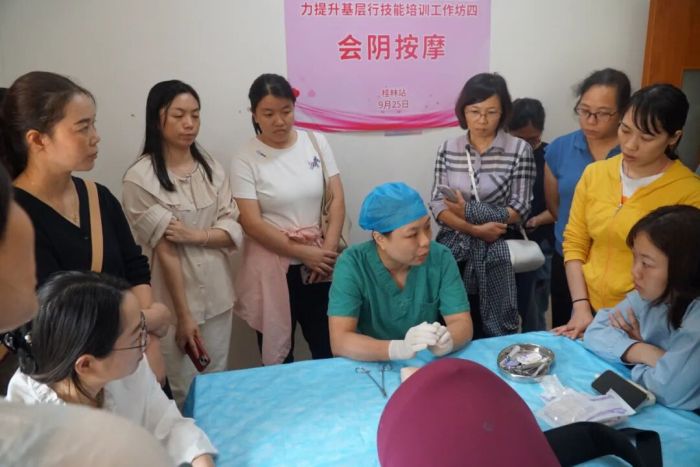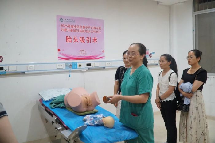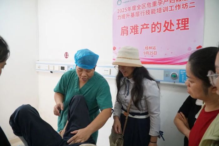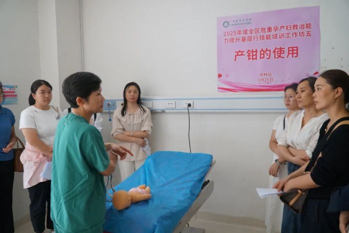 9 月 25 日下午,7 个 “循环站式工作坊” 同步开展,成为本次培训的 “实战亮点”。在 “孕产妇心跳呼吸骤停处理团队配合” 工作坊,梁旭霞、卢燕群专家现场指导学员模拟抢救流程,强调分工协作与时间管理;“肩难产处理”“产钳使用”“胎头吸引”“会阴裂伤缝合” 等工作坊,则通过模拟教具实操,让学员亲手掌握关键操作技巧,纠正不规范动作;桂林市妇幼保健院团队主导的 “子痫抽搐处理” 工作坊,通过急救演练模式,情景再现,帮助学员熟悉并掌握子痫抢救及新生儿窒息复苏的处置流程。每个工作坊均采用 “演示 + 实操 + 点评” 模式,确保学员 “学得会、用得上”。