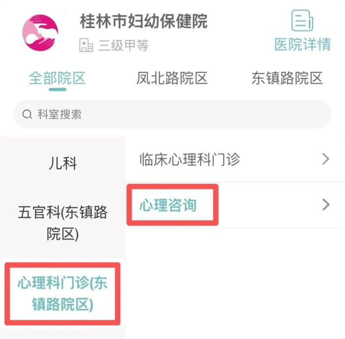 关注“桂林市妇幼保健院智慧医院”微信服务号,点击下方菜单栏“就诊服务”→“预约挂号”→“心理科门诊(东镇路院区)”→“心理咨询”,选择出诊时间段(12:30-13:20;13:30-14:20)的出诊心理治疗师,进行预约。