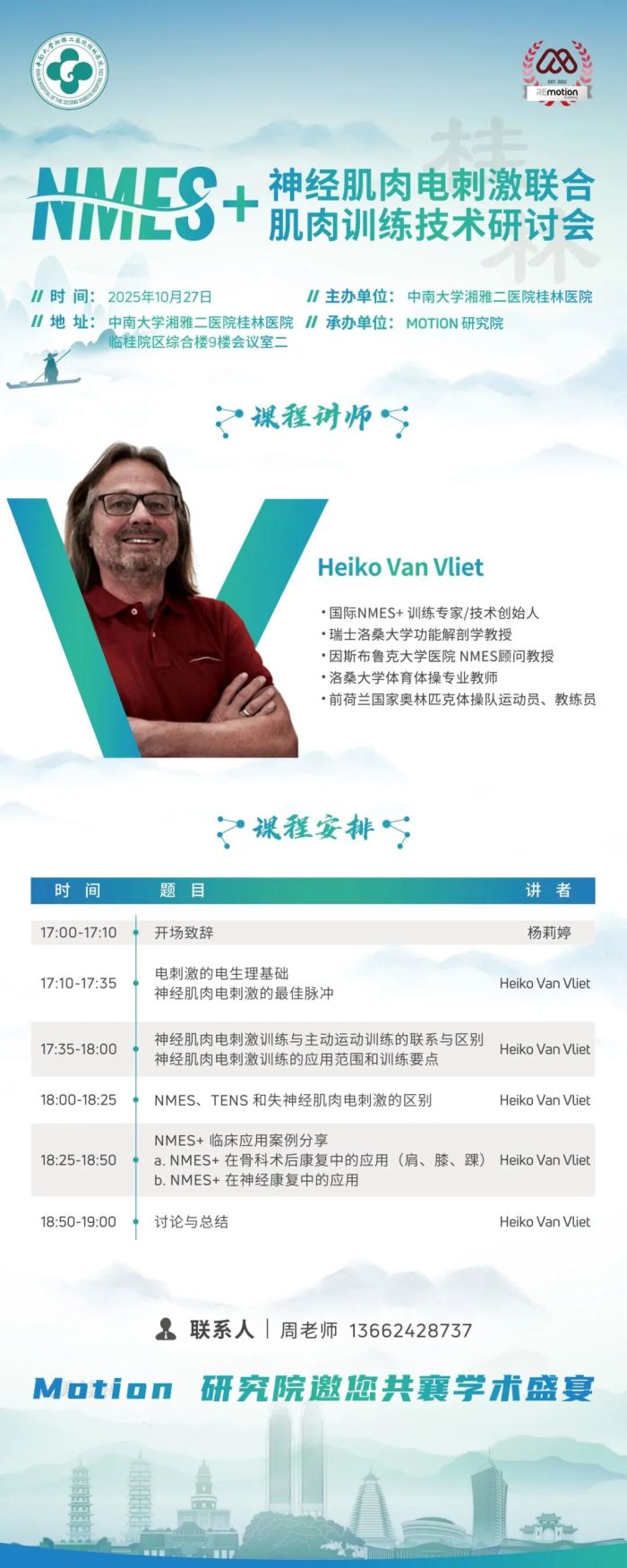 10月27日,中南大学湘雅二医院桂林医院将迎来一场康复医学领域的国际前沿盛宴——NMES+神经肌肉电刺激联合肌肉训练技术研讨会。
