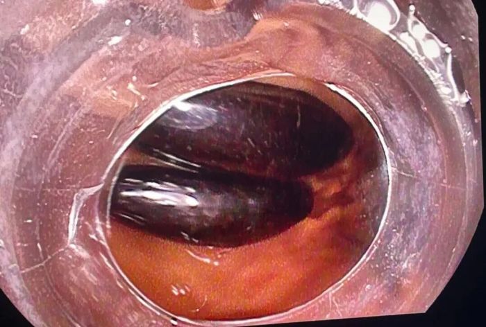 手术由消化内科朱珠医生和李燕玲医生相互配合操作。胃镜下可见两颗椭圆形磁力珠紧密吸附,由于磁力珠表面非常光滑,大大增加了取出的难度。三个科室手术团队紧密合作,尝试各种方法,最后采用“圈套器+医用乳胶防护套”联合方案——用异物钳将无菌乳胶套送入胃内,用圈套器套住磁力珠送入乳胶套内,再用异物钳将乳胶套成功取出!
