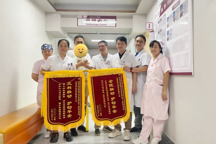 术后,奇奇生命体征平稳,转入儿科病房观察后顺利康复出院。家属对医院多学科合力救治孩子非常感激,送来了“三科联动,护幼平安”的锦旗。